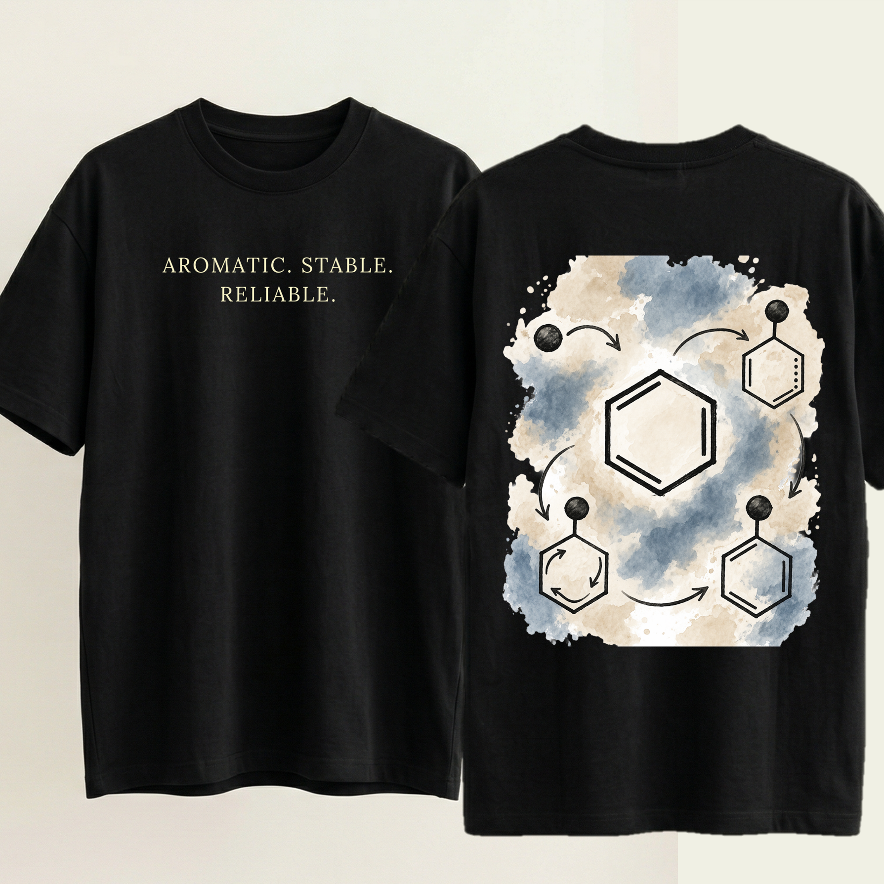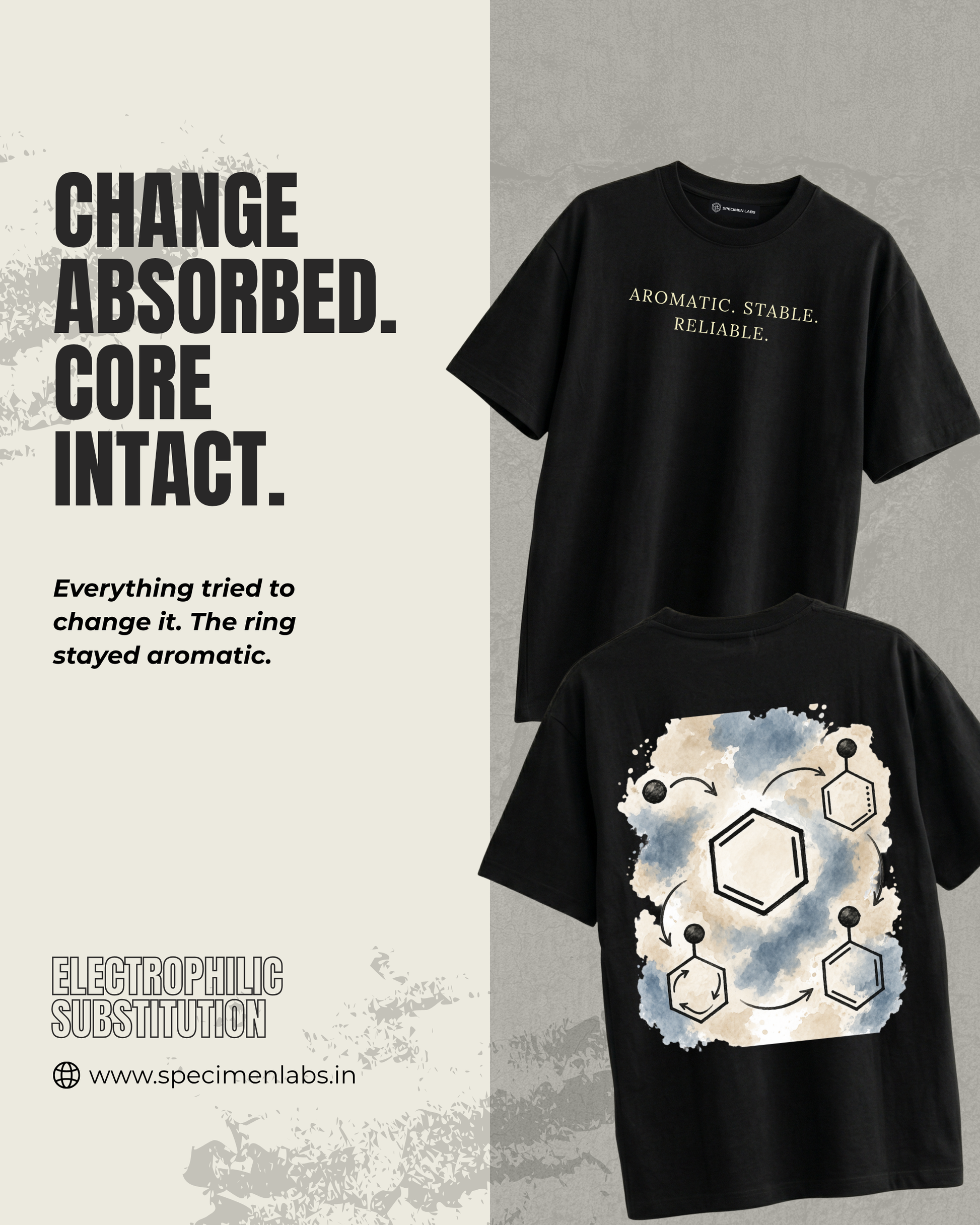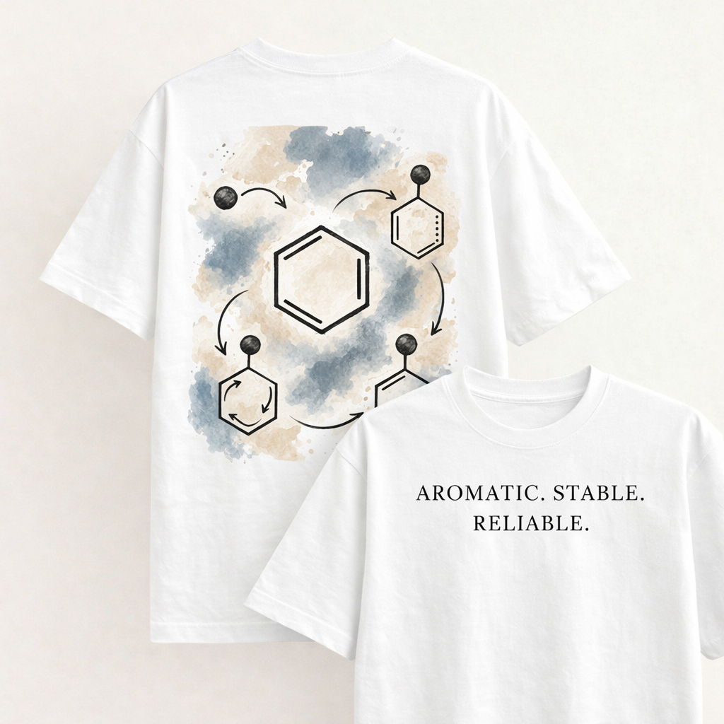 The back artwork captures this process in motion: the benzene ring at the center, with substituents entering, leaving, and rearranging—yet the system remains intact. Cyclical. Predictable. Reliable.